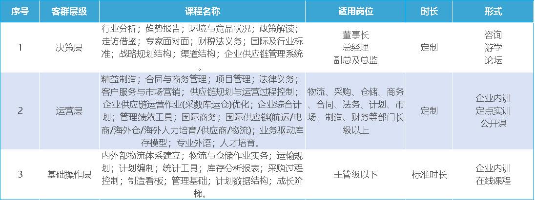 很多企业选用CILT 5级课程体系作为供应链与物流、采购和运营管理部门员工的入职培训,CILT 6级课程体系作为供应链或运营(计划、运营、采购、仓储、商务、合同、法务、营销、物流、市场、制造、项目管理、财务会计等)相关的管理职位(经理、总监、副总、总经理、董事长)的进阶培训,系统提升各部门成员的知识、技能与认知水平。